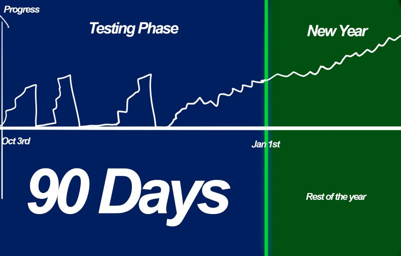 I treat this 3-month period as the testing phase. This is the long rope to my wild horse. In these 3 months, I can experiment and FAIL as much as I want while I explore what it takes to pursue these new goals.